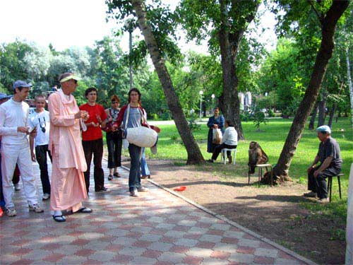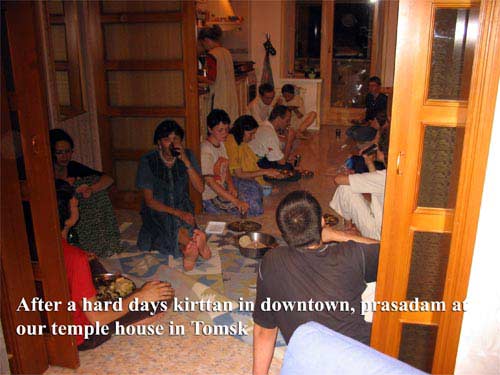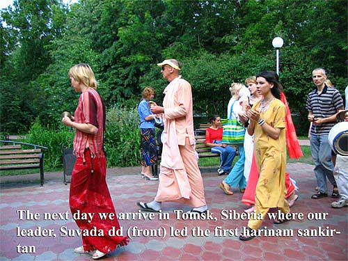 На следующий день в Томске. Сувада дд местный лидер ведет первую Харинама Санкиртану.
