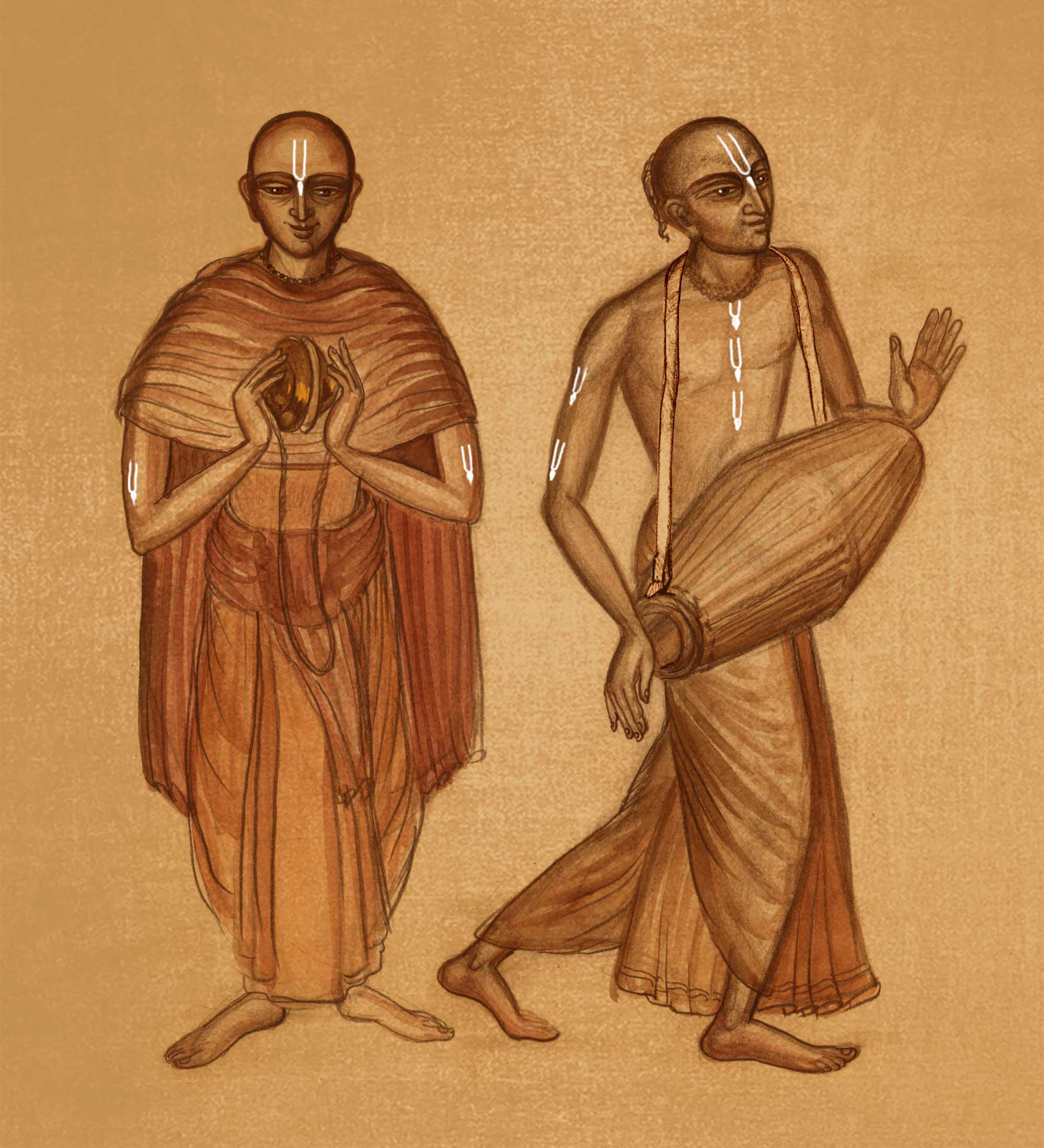 Эти инструменты неразрывно связаны с трансцендентной лилой. Барабан мриданга — проявление формы Нитьянанды Прабху. Его личность полностью проявлена в мриданге, поскольку Он хотел удовлетворить Господа [Гаурангу] через звуки, которые издает этот барабан. Если мы будем играть мантры мриданги, которые даны гуру-варгой, которые даны мриданга-гуру, линия которого начинается от самого Нароттама Даса Тхакура, то можно сказать так, что личность, которая проявлена в мриданге [Нитьянанда Прабху], будет удовлетворена этим и захочет явить Себя, захочет выражать Свои чувства через игру.