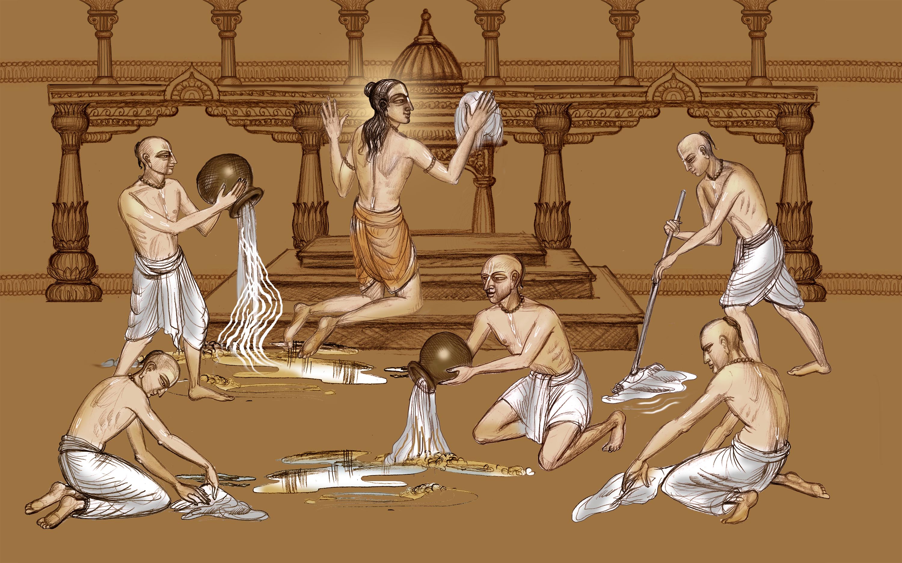 “We were given perfect instructions how to proceed today. That means not just cleansing the temple, buildings, but also means, first of all, to clean our own heart and mind. This is the proper mood and Mahaprabhu explained in details how it should be done. What is gonna happen today is practice. Let’s see, how much attention, how much love we can put in our labour and by that we can judge our own progress.”