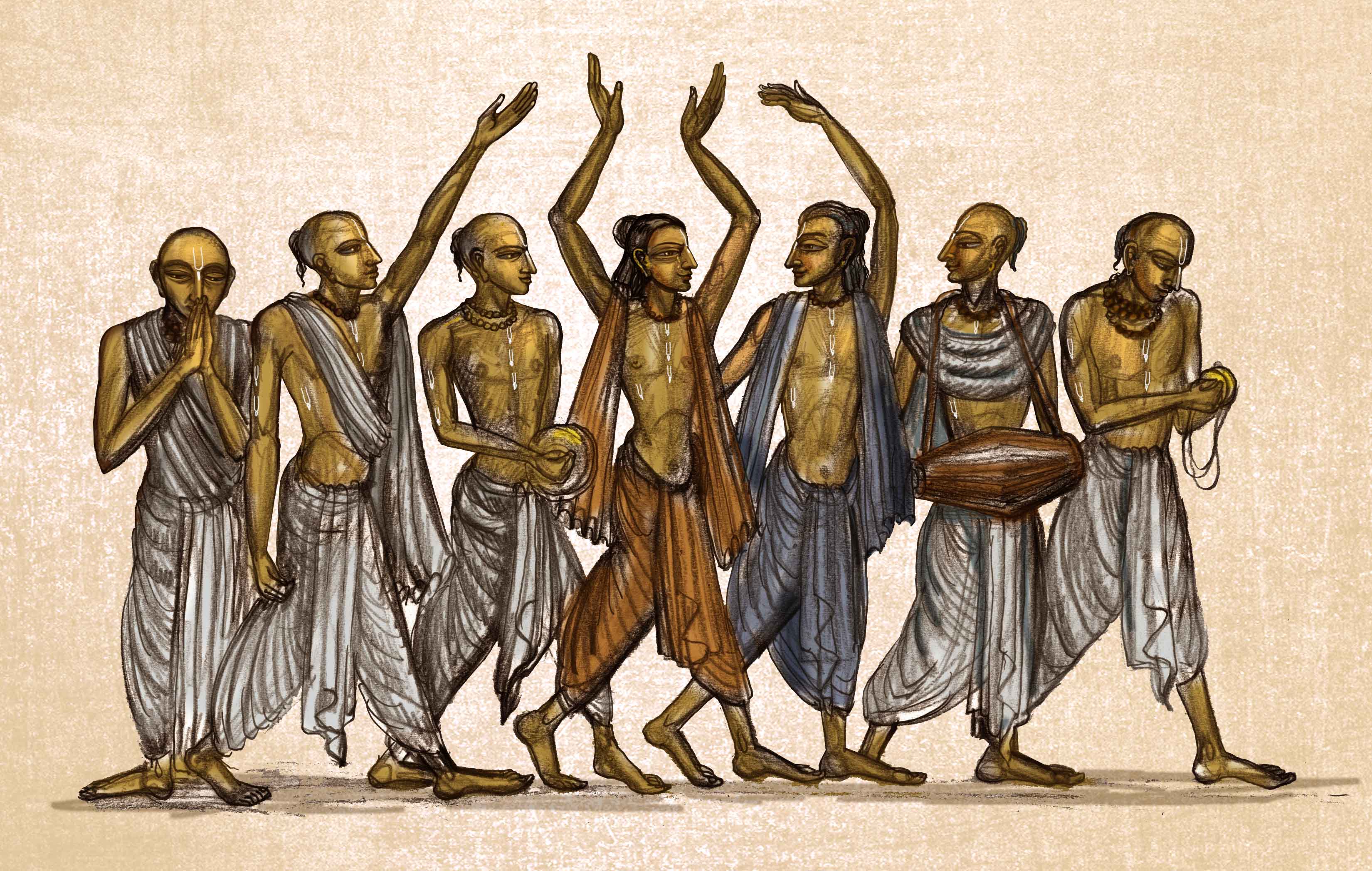 Когда же прерывающимся от экстаза голосом я воскликну Имя Гауранги? Когда, уединившись в том краю, я пролью там слезы? Когда же, объятый священной любовью, увижу я Шри Гаурасундару, пьющего воду из старого металлического кувшина Шридхары? И когда, по великой своей удаче, смогу я узреть юного сына Шачи — посреди киртана в доме Шридхары, вместе с Нитьянандой, Адвайтой, Гададхарой и Шривасой, танцующего, поющего и молящегося о любви к Господу?