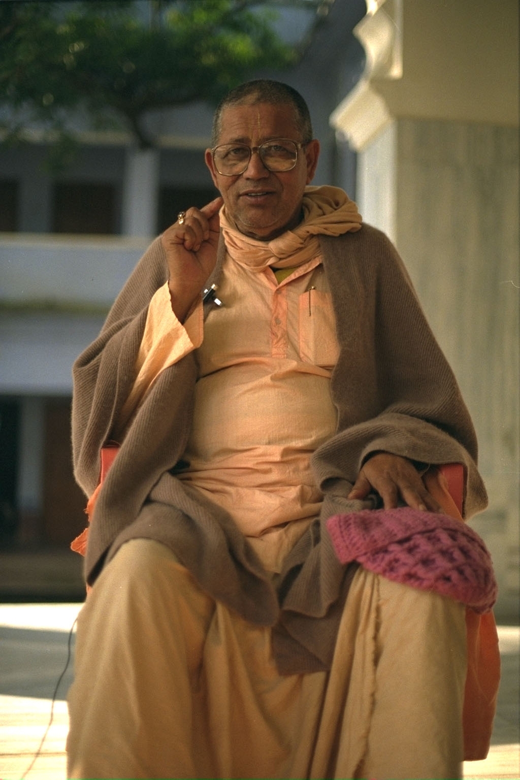 Мадхусудан Махарадж: Итак, после того как он описал огромную потребность в том, чтобы мы искали Шри Кришну, прекрасную реальность, затем Гуру Махарадж говорит: «И кто настоящий даритель в этом мире? Это человек, который приносит вести, новости о Господе, новости о Кришне, об этом [духовном знании]. И не только новости, но процесс, которым мы придем к Нему». Итак, здесь у нас есть Гуру Махарадж вживую: в этот день в ноябре 1982-го года [он] обращается к преданным, собравшимся там. Гуру Махарадж прекрасно знает, что эти беседы, что он дает, они будут записаны и будут превращены в публикации и так далее. Иногда в те дни три-четыре микрофона были прицеплены к его уттарии. И по мере того, как день становился теплее, он снимал уттарию, и эти микрофоны снова снимали и снова надевали. Иногда на записях вы можете услышать: щелк-щелк-щелк. Вы можете понять, что происходит: может быть, он снимает свою уттарию, снимает какой-то слой одежды, а потом снова надевает ее.