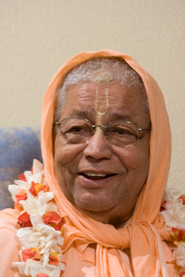 Когда мы читаем такие истории… Преданность превыше всего всегда. Если мы говорим о Ведах, о ведической культуре, о правилах Вед, то последнее слово Вед — это преданность, служение из преданности. И когда мы читаем эту историю о том, как один мясник взвешивал [мясо, используя шалаграм-шилу в качестве гири]… На самом деле эту историю рассказал Гурудев Шриле Авадхуту Махараджу. Шрилу Авадхута Махараджа, когда он впервые увидел своего духовного учителя, очень сильно мучил вопрос… Это было в Америке. Это описано в его дневнике. Его очень сильно мучил вопрос, который он боялся задать. Долгое время он был в другой вайшнавской организации… Сейчас мы не будем о ней говорить. И в этой организации ему говорили определенные вещи, с которыми он не был внутренне согласен. И он хотел Гурудеву вопрос задать. Он говорит: «Меня этот вопрос очень мучил, и я боялся его задать. Почему я боялся его задать? Потому что я был очарован личностью Говинды Махараджа. Но я боялся спросить, потому что вдруг я ответом буду разочарован». И он так робко спросил: «Может ли человек служить Господу, если он несовершенен, если не может соблюдать все принципы духовной жизни?» И Гурудев очень сильно оживился и рассказал эту историю о мяснике, который взвешивал мясо при помощи шалаграма.