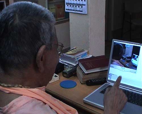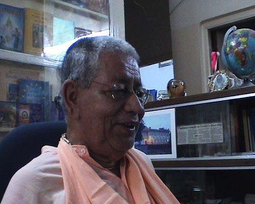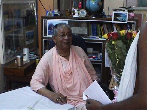 Бхакти Сундар Говинда Дев-Госвами Махарадж принимает цветы для Божевств.