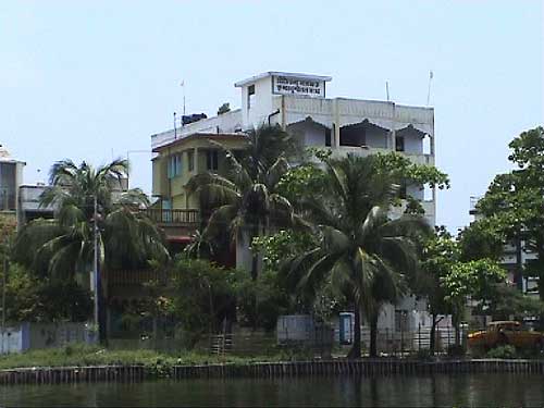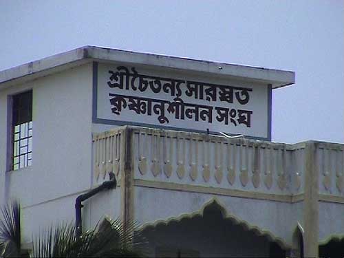 здание ашрама Шри Чайтанья Сарасвата Кришнанушилна Сангха. Флаги и флагштоки